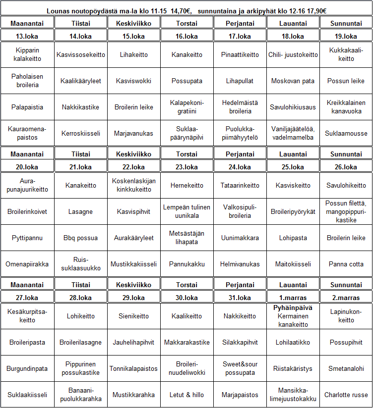 Lounas noutopöydästä Ma-La klo 11:00-15:00. Sunnuntai ja arkipyhät klo 12:00-16:00. Hinta arkisin 14.70 sunnuntai ja pyhät 17.90. Lapset alle 12v puoleen hintaan . Alle 4v ilmaiseksi, ruokailevien vanhempien mukana.