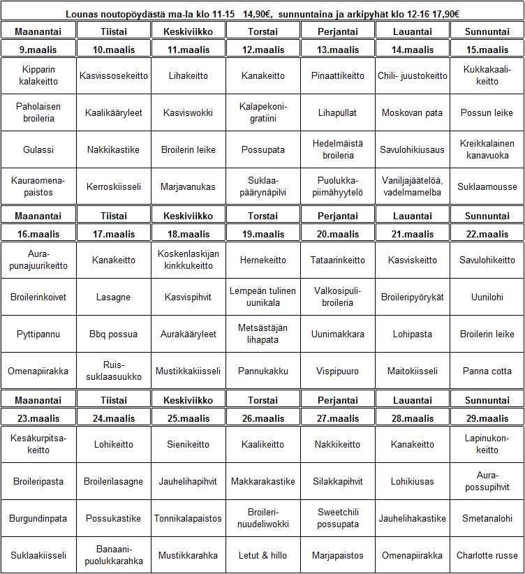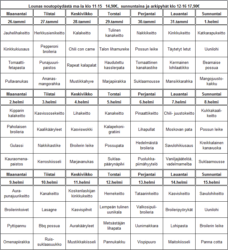 Lounas noutopöydästä Ma-La klo 11:00-15:00. Sunnuntai ja arkipyhät klo 12:00-16:00. Hinta arkisin 14.90 sunnuntai ja pyhät 17.90. Lapset alle 12v puoleen hintaan . Alle 4v ilmaiseksi, ruokailevien vanhempien mukana.